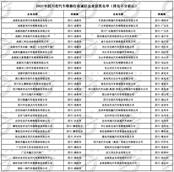 2021年四川省汽車維修行業誠信企業獲獎名單