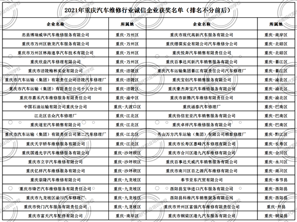 2021年重慶汽車維修行業誠信企業獲獎名單