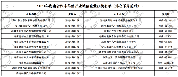 2021年海南省汽車維修行業誠信企業獲獎名單