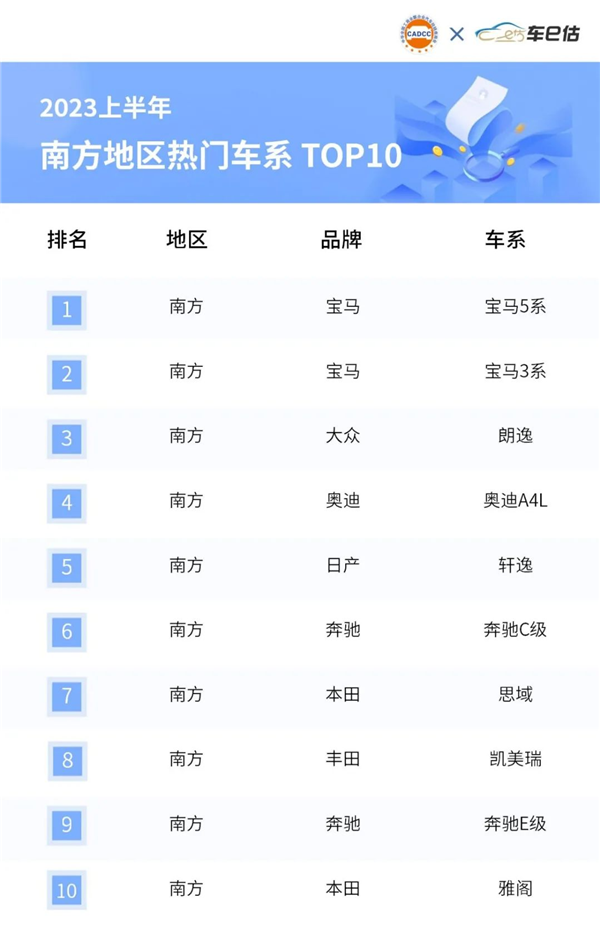 二、南方及北方地區熱門車系TOP10