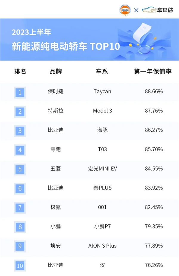 新能源純電動轎車這一領域,先看前三名。最保值車型是保時捷Taycan,保值率達88.66%。特斯拉Model 3和比亞迪海豚以微弱優勢排在保時捷Taycan之后,兩者保值率為87.76%、86.27%。零跑T03及五菱宏光MINI EV排名第四、第五。榜單下游的比亞迪秦PLUS和極氪001一年保值率也超82%以上。小鵬P7、埃安AION S Plus、比亞迪漢躋身榜單前十名。