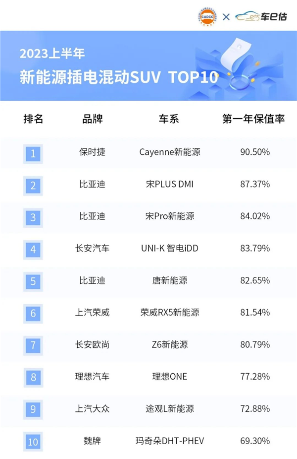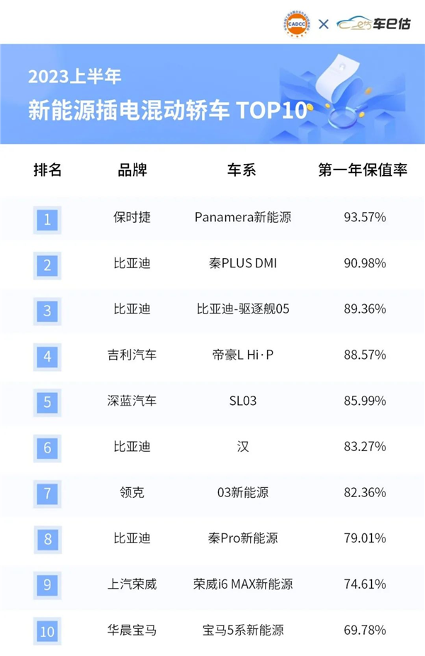 插電混動轎車方面,自主品牌取得斷層式優勢,合資品牌僅有兩款車型上榜。其中,一年保值率最高的是保時捷旗下Panamera新能源,保值率達93.57%。另一款合資車型來自華晨寶馬5系新能源,排名第十。而自主品牌這邊,比亞迪多個插電混動車型進入榜單,包括比亞迪秦PLUS DMI、驅逐艦05、漢、秦Pro新能源,分列榜單第二、第三、第六、第八。吉利帝豪L Hi·P、長安深藍SL03位于榜單第四、第五,兩者保值率依次為88.57%、85.99%。領克03新能源及上汽榮威i6 MAX新能源進入前十。