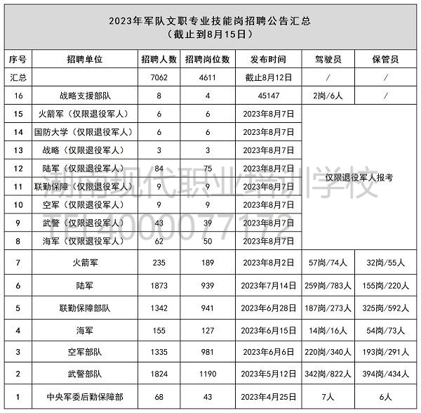 像去年,在口罩的影響下,也招了11批技能崗。而2023年,截止到8月15日,部隊文職技能崗就已經發布了16批招考公告,總計4611個崗位,7062人。其中司機、保管員等將近4000人,絕對的熱招崗位。