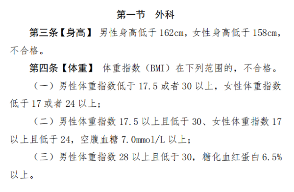 在2023年公布的《軍隊選拔軍官和文職人員體檢標準》中,對于身高、體重、視力以及各項身體指標都有明確的說明,而且男性、女性標準不一樣。