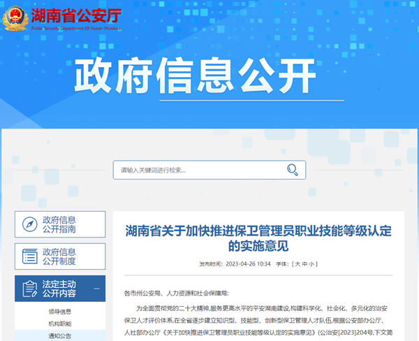 為全面貫徹黨的二十大精神,服務更高水平的平安湖南建設,構建科學化、社會化、多元化的治安保衛人才評價體系,在全省逐步建立知識型、技能型、創新型保衛管理人才隊伍,根據公安部辦公廳、人社部辦公廳《關于加快推進保衛管理員職業技能等級認定的實施意見》(公治安[2023]204號,下文簡稱《意見》,見附件1)和人社部《關于健全完善新時代技能人才職業技能等級制度的意見(試行)》(人社部發[2022]14號)等文件精神,結合我省實際,現就進一步加快推進我省保衛管理員職業技能等級認定工作提出以下實施意見。