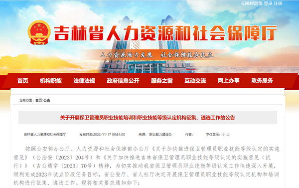 按照公安部辦公廳、人力資源和社會保障部辦公廳《關于加快推進保衛管理員職業技能等級認定的實施意見》(公治安〔2023〕204號)和《關于加快推進吉林省保衛管理員職業技能等級認定的實施意見(試行)》(吉公通字〔2023〕70號)精神,為切實推動我省保衛管理員職業技能等級認定工作快速深入開展,順利完成2023年試點階段任務目標,省公安廳、省人社廳決定開展保衛管理員職業技能等級認定機構和培訓機構進行征集、遴選工作。現將相關要求通知如下: