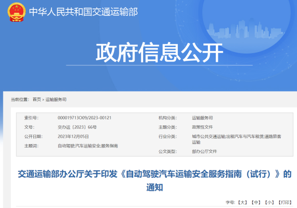 交通運輸部辦公廳關于印發《自動駕駛汽車運輸安全服務指南(試行)》的通知