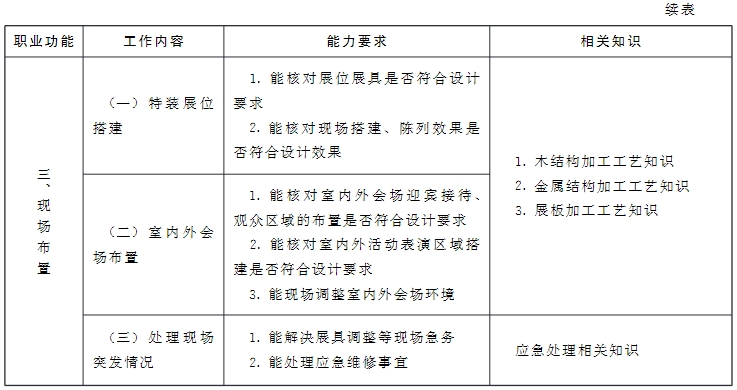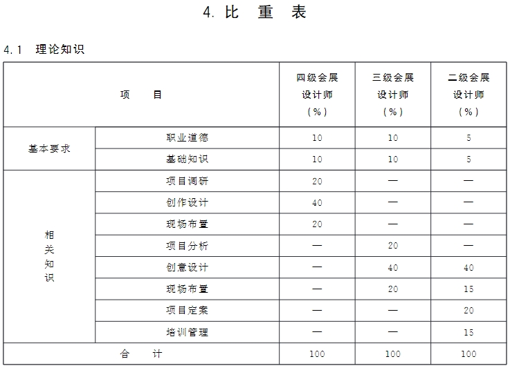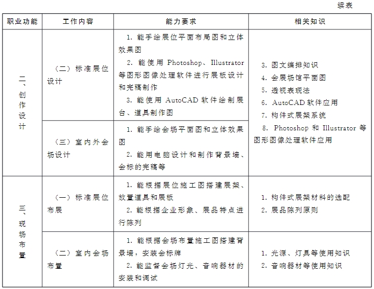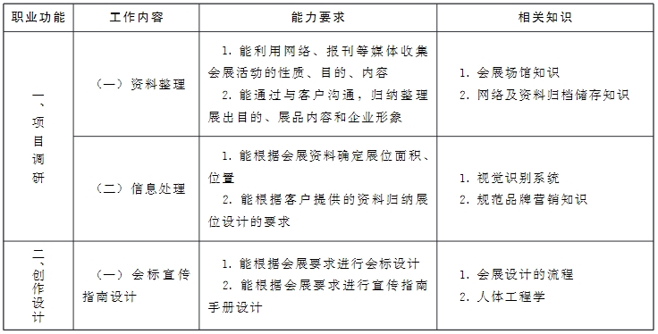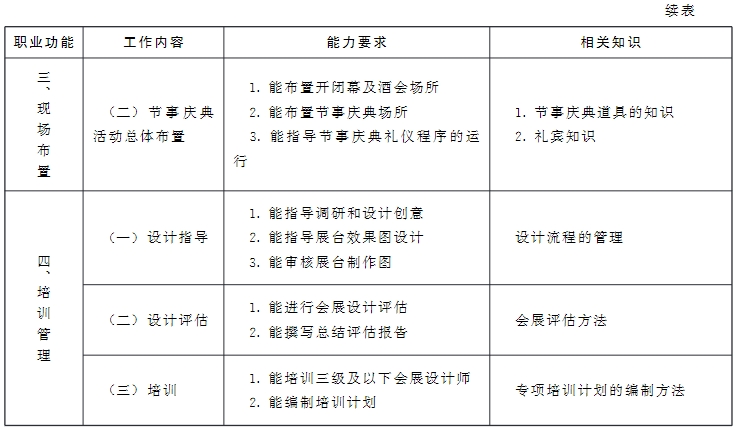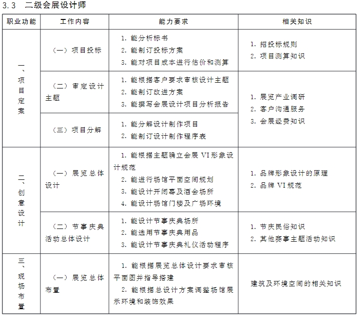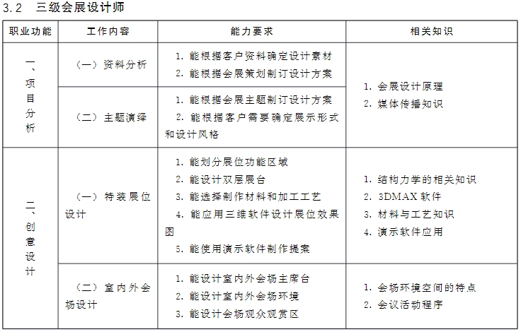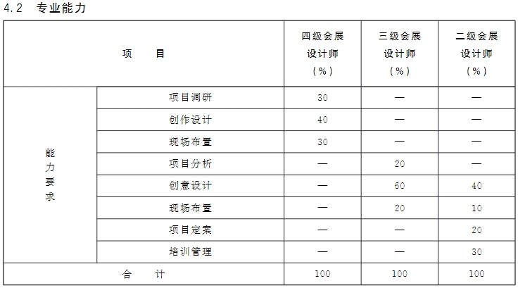 本標準對四級會展設計師、三級會展設計師、二級會展設計師的能力要求依次遞進,高級別涵蓋低級別的要求