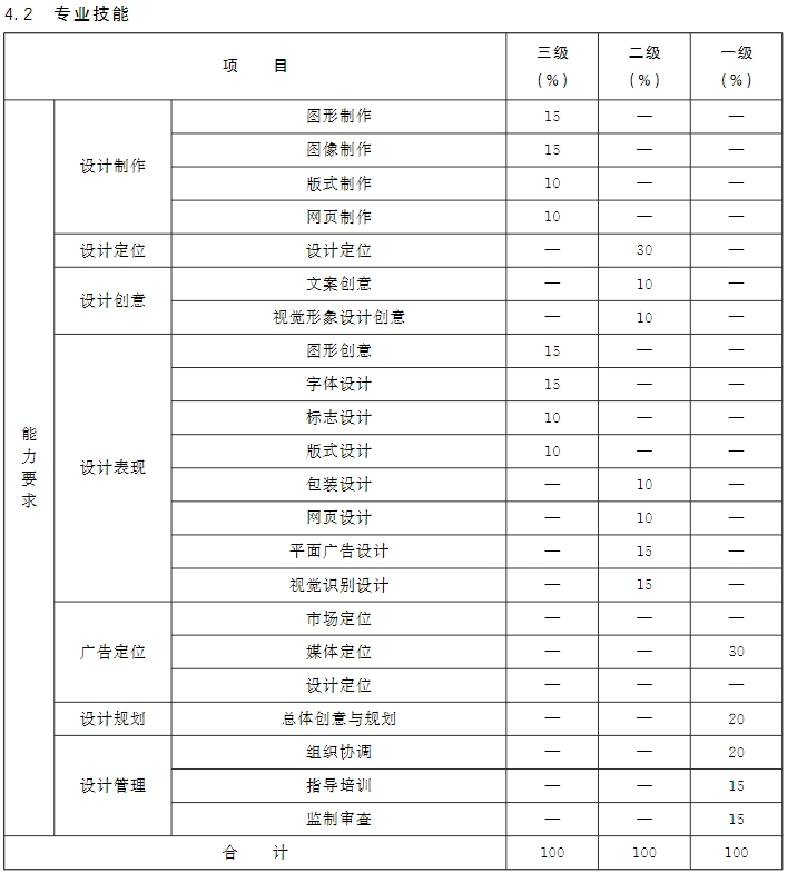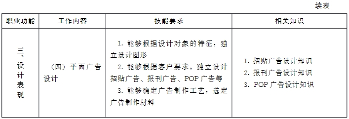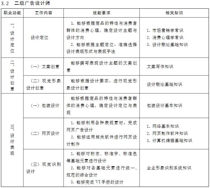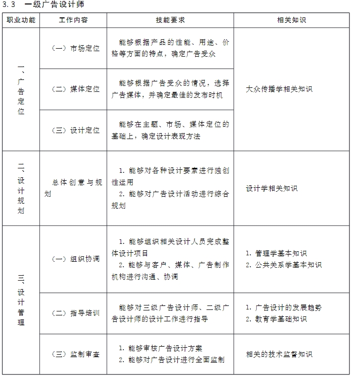 本標準對三級廣告設計師、二級廣告設計師和一級廣告設計師的能力要求依次遞進,高級別涵蓋低級別的要求。