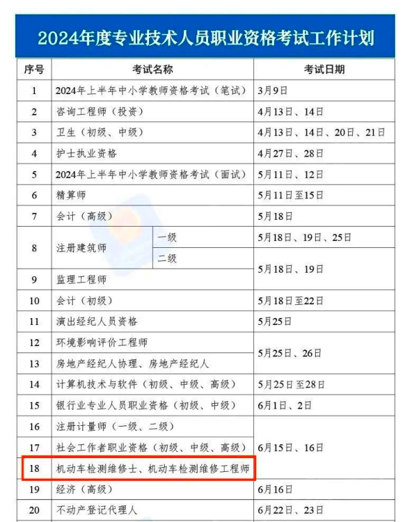 近日,人力資源社會保障部辦公廳印發《關于2024年度專業技術人員職業資格考試工作計劃及有關事項的通知》。大家關心的機動車檢測維修士、機動車檢測維修工程師,考試時間表定了!