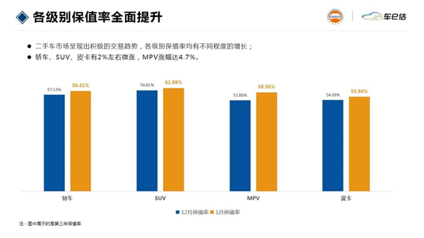 本月二手車市場迎來了開門紅,各級別保值率均有不同程度的提升。其中,轎車由57.13%升至59.41%,SUV這一細分市場也有1.28%漲幅。MPV市場熱度最高,由上月的53.86%漲至58.56%,漲幅達4.7%。皮卡微漲,保值率為55.94%。