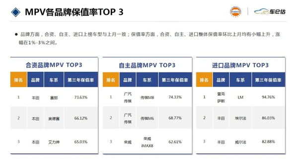 合資MPV中,賽那以73.63%高保值成為本月最保值MPV車型。奧德賽排名第二,保值率為66.12%。排名第三的是艾力紳,保值率達65.03%。從數據可以看出,合資車企這幾款車型保值率與自主品牌已相差無幾,說明合資品牌的生存空間受到自主品牌一定程度的擠壓。