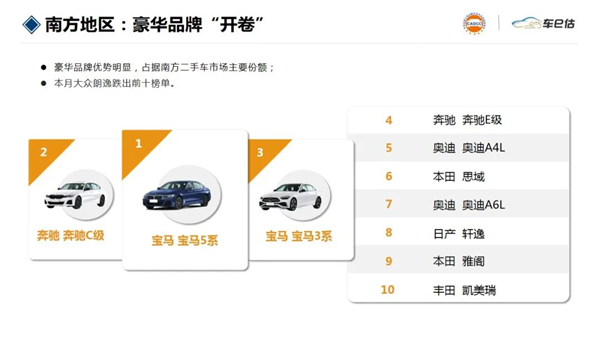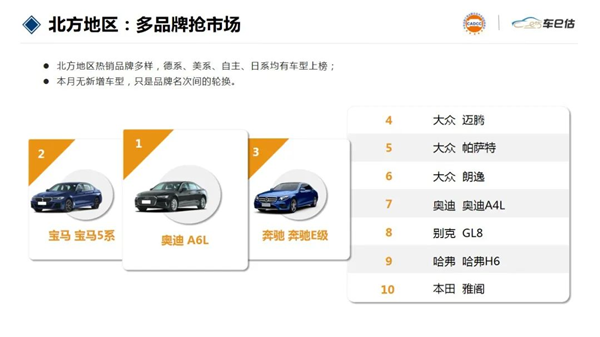 北方地區上榜品牌較多元化,既有保有量大的日系、德系,也有市場份額逐年攀升的自主。其中,德系優勢比較明顯,本月共有7款車型進賬。奧迪A6L、寶馬5系、奔馳E級是北方地區熱銷前三車型。大眾邁騰、大眾帕薩特、大眾朗逸分列榜單第四至第六,奧迪A4L排名第七。美系、自主、日系雖說在北方地區的整體實力比不上德系,但也有熱銷車型上榜,分別是別克GL8、哈弗H6、本田雅閣,位列榜單第八至第十。