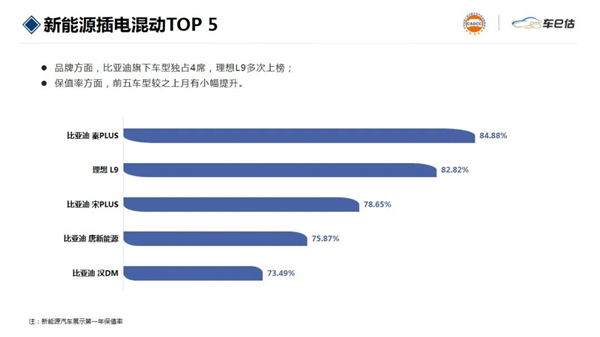 通過榜單不難發現,插電混動這一大類別的車型依然是以“老面孔”為主力,遠沒有純電車型那樣新人輩出。銷量“開掛”的比亞迪最為亮眼,旗下秦PLUS、宋PLUS、唐新能源、漢DM上榜,分別排名第一、第三至第五。其中,秦PLUS保值率最高,達84.88%。理想L9排名與上月一致,保值率為82.82%。