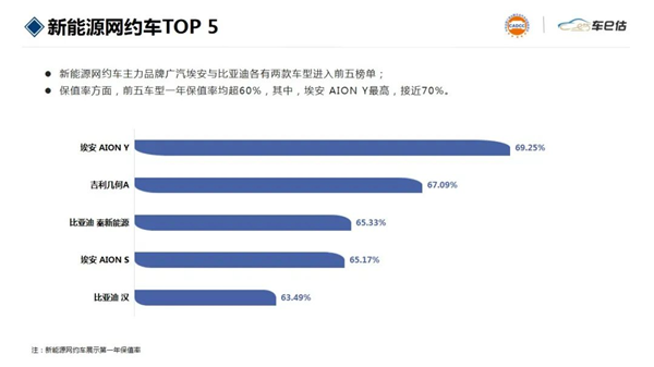 廣汽埃安與比亞迪是網約車出行市場大贏家,旗下各有兩款主力車型上榜。其中,廣汽埃安AION Y以69.25%保值率領跑,另一款車型廣汽埃安AION S排名第四,保值率為65.17%。比亞迪秦新能源、比亞迪漢分列第三、第五,兩者保值率分別達65.33%、63.49%。吉利幾何A排名第二,保值率為67.09%。網約車應用場景聚焦在出行運營,司機日常運營時間長,高頻用車對車況的影響較大,保值率也隨之偏低。