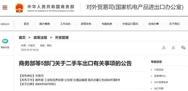 政策閱讀:商務部等5部門關于二手車出口有關事項的公告:流通企業雇傭至少3名鑒定評估專業人員