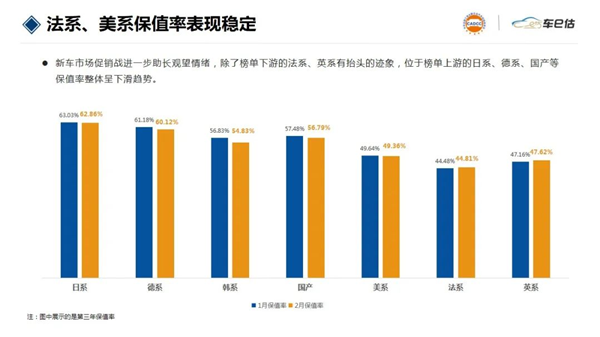 2月正值春節假期期間,居民返鄉潮、返工潮集中,消費者汽車購買積極性不高,各系別保值率沒有出現明顯的回升。日系、德系保值率維持在60%左右,韓系及國產呈下滑勢頭,保值率分別為54.83%、56.79%。美系基本與上月持平,法系及英系保值率呈現回升跡象。