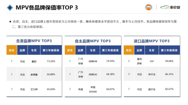 合資品牌里,MPV市場有著共同的主題詞,那就是中高端化。以豐田賽那、本田奧德賽、本田艾力紳為首的中高端MPV車型,各方面實力都達到了較高水準,加上市場的口碑反饋一向不錯,保值率表現比較穩定,本月三者保值率分別為73.26%、66.88%、65.60%。