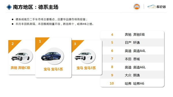 南方地區的排位賽,德系依然是最大的看點,且豪華品牌備受市場青睞。榜單前四名來自寶馬5系、奔馳C級、寶馬3系、奔馳E級,可見南方人對豪華品牌的喜愛是滲透在骨子里的。奧迪A4L排名第六,北方地區的銷量冠軍奧迪A6L則排名第八。本月的日系整體實力與德系拉開較大差距,僅有兩款車型上榜,分別是日產軒逸、本田思域,分列榜單第五、第七。北方二手車市場排名第五的大眾朗逸,在南方市場熱度則稍低,排名第九。除此之外,自主品牌車型哈弗H6作為SUV銷量榜中的“常勝將軍”出現在榜單之中,排名第十。
