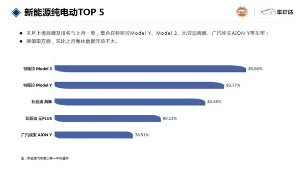 純電動車保值率總排行榜單中,特斯拉Model 3與Model Y高居榜首,兩者第一年保值率均保持在83%以上,基本做到與燃油車平均保值率持平的水準。排名第三的比亞迪海豚,本月的表現也不甘示弱,保值率達82.68%。榜單的第四、第五名分別是比亞迪元PLUS、廣汽埃安AION Y,保值率依次為80.12%、78.51%。目前新能源汽車保有量已經突破了千萬大關,隨著新能源汽車產品力的提升,市場端消費者對于純電動車型的接受度會越來越高。