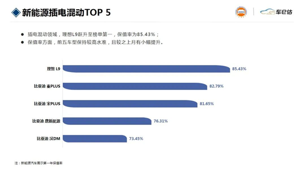 插混領域,理想汽車的明星車型L9熱度不減,以85.43%保值率成為最保值插電混動車型。榜單第二至第五名由比亞迪包攬,雖說比亞迪在本月率先打破價格壁壘的排頭兵是插混車型,并打出“電比油低”的口號,但其四大王炸車型:秦PLUS、宋PLUS、唐新能源、漢DM保值率卻絲毫不受影響,且保持了較高水準,分別達82.79%、81.65%、76.31%、73.45%。插電混動車型可油可電的便捷性,已經通過市場表現得到了認證。