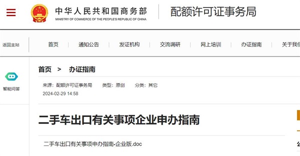 商務部負責全國二手車出口的政策制定、業務指導、部門協調和監督管理。為推動二手車出口業務健康、有序發展,方便企業申領二手車出口許可證,現發布有關申辦指南。