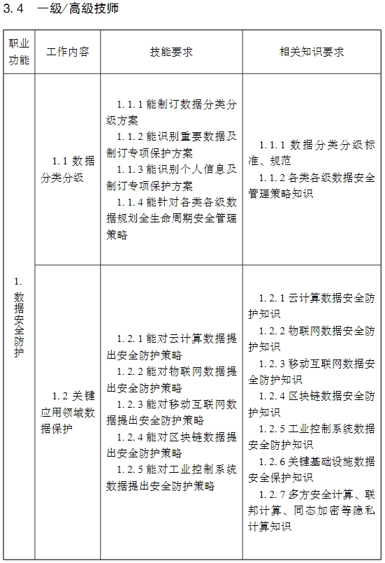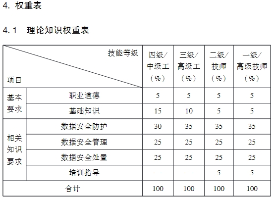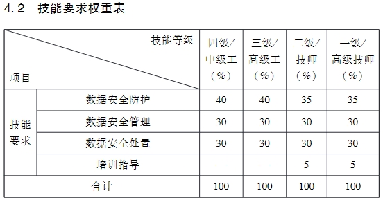 本職業數據安全管理員工種共設四個等級,分別為: 四級/中級工、三級/高級工、二級/技師、一級/高級技師。