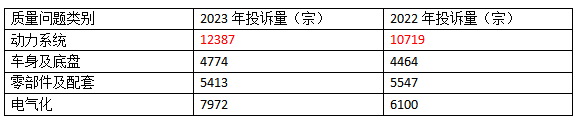 質量問題投訴分為四大類,為動力系統、車身及底盤、零部件及配套和電氣化。其中,動力系統投訴問題占據全年質量問題“大頭”,同比增長15.56%,全年投訴量達到了12387宗。