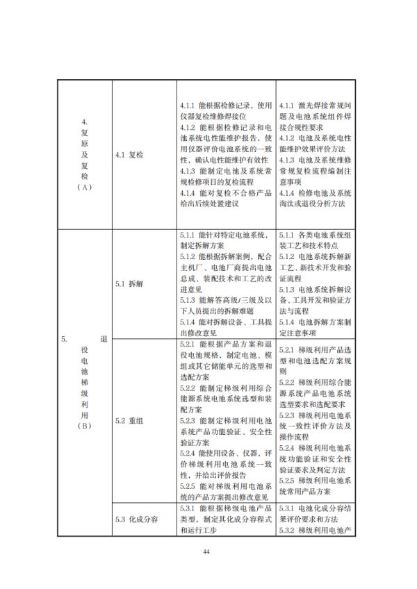使用工、夾、量具和儀器儀表、檢修和均衡等設備,評估、維護、拆裝、修理、故障修復、報廢、拆解 ,重新匹配組裝和調試電池及電池系統的人員。