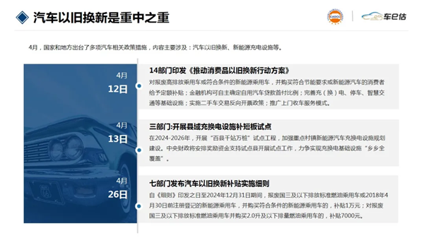 本月汽車政策密集出臺,涉及范圍廣。先是在今年兩會政府工作報告中提到,要擴大智能網聯新能源汽車等產業領先優勢、鼓勵和推動汽車消費品以舊換新。緊接著國務院落實汽車以舊換新行動方案具體細則,推動汽車報廢更新的發展,使汽車全生命周期鏈條實現有效完整的流轉。此外,還提及要支持二手商品流通交易,持續優化二手車交易登記管理,促進便利交易,大力發展二手車出口業務。