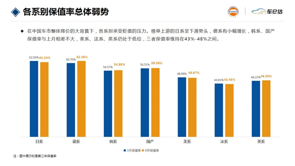 為拉動消費,多地政府出臺支持汽車消費政策,加上各大品牌車企“扎堆”推出各種購車福利,置換補貼、定金膨脹、無憂保養等多種促銷優惠,對二手車市場的交易形成一定影響,本月各系別保值率整體下滑。具體到各系別上,日系、德系保值率維持在60%左右。韓系與國產保值率也比較接近,分別達54.57%、56.61%。美系與上月相差無幾,為48.99%。法系與英系保值率依次為43.81%、46.22%。