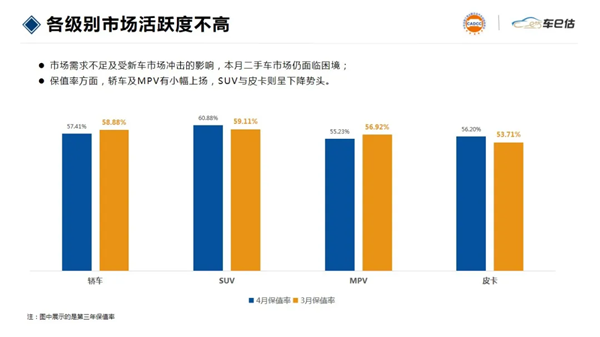 各級別市場保值率浮動不大。轎車保值率基本與上月持平,為57.41%,MPV本月保值率達55.23%。從數據上看,MPV與轎車的差距在縮小。去年開始,轎車市場份額下滑,而MPV份額上漲,這說明消費者對于MPV的需求在不斷增加,這也是各大車企爭相涌入MPV市場的原因。SUV方面,保值率維持在60%左右。皮卡保值率保持增長趨勢,達56.20%。隨著皮卡乘用化和智能化的發展,國內皮卡用戶對產品的認可度也明顯提高。