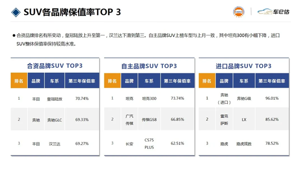 合資品牌SUV保值率榜單,豐田漢蘭達保值率依舊較為穩定,本月達72.19%。豐田皇冠陸放和奔馳GLC排名沒有發生變動,受新車優惠幅度影響較小,兩者保值率與漢蘭達的差距并不大,分別為70.94%、68.63%。