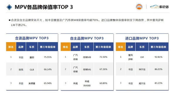 合資MPV保值率榜單,豐田賽那、本田奧德賽、別克GL8表現依然強勢,三者保值率較之上月變化不大,依次為73.55%、66.81%、65.43%。這三款車型良好的商務性能和足夠大的空間十分符合市場預期,在銷量及保值率表現上向來有保證。