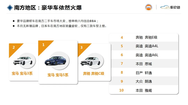雖說因傳動軸異響問題,寶馬在今年的315晚會上被央視點名,但也不影響其在南方二手車市場的熱賣。本月南方地區熱銷第一、第二名是寶馬5系、寶馬3系。奔馳C級位列第三。再來看榜單中游的排名情況,德系的奔馳E級與奧迪A4L分列第四、第五。日系的本田思域、日產軒逸位于榜單中下游,排名第六、第七。在北方地區的“走量王”奧迪A6L在南方市場熱度沒那么高,排名第八。大眾朗逸、本田雅閣排名較靠后,分列第九、第十。