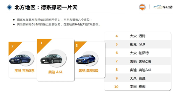 本月北方市場熱銷車型的排名變化較大,前三位置由奧迪A6L、寶馬5系、奔馳E級獲得。上月的銷量季軍大眾邁騰,下滑一個名次,排名第四。而上月排名第十的別克GL8,本月躍升至第五。別克GL8這款車型向來是中高端MPV市場的中流砥柱,在合資品牌MPV保值率榜單中也長期占有一席之地。大眾帕薩特、大眾朗逸分列第六、第七。奧迪A4L名次與上月一致,排名第八。本田雅閣、哈弗H6位于榜單第九、第十。