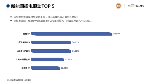 插電混動市場,理想L9連續多月登頂最保值混動車型位置,本月保值率為85.23%。比亞迪品牌多款車型擠入榜單前五中,包括秦PLUS、宋PLUS、唐新能源、漢DM。這四款車素以性價比聞名,而且去年官方很少降價,因而保值率得以保障。不過今年比亞迪旗下的產品統統推出了榮耀版,增配還降價,保值率有所影響。環比上月,秦PLUS、宋PLUS、唐新能源、漢DM保值率有小幅下滑,分別為82.69%、78.25%、76.12%、73.22%。