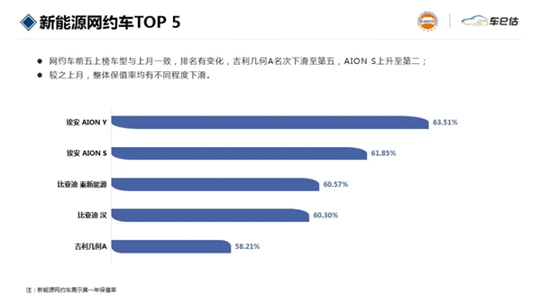 新能源網約車市場前五車型排名不變,保值率最高的是廣汽埃安AION Y,達65.21%。吉利幾何A與比亞迪秦新能源分列第二、第三,兩者保值率非常接近。榜單第四、第五來自埃安AION S、比亞迪漢,保值率分別為61.85%、60.20%。整體來看,前五車型保值率沒有太大出入。
