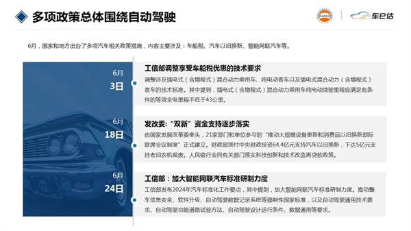 本月政策聚焦自動駕駛。先是本月初工信部等四部門有序開展智能網聯汽車準入和上路通行試點,接著工信部發文,提出加大智能網聯汽車標準研制力度,推動整車信息安全、軟件升級、自動駕駛數據記錄系統等強制性國家標準,以及自動駕駛通用技術等要求,開展網聯化等級劃分、列隊跟馳等標準預研,規范和引領智能網聯汽車產品發展。五部門發布的推動打造消費新場景政策中同樣提及,要穩步推進自動駕駛商業化落地運營,“車路云一體化”成為其中重點。