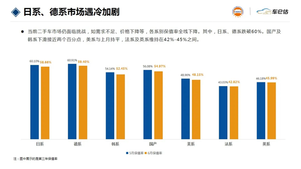 雖說以舊換新等政策合理保證了燃油車消費群體的換購需求,但二手車市場仍處于不景氣區間。先看榜單上游情況,日系、德系保值率不足60%,韓系下降接近2%。近幾年來,以日系、德系為首的合資品牌保值率連續下滑已成事實,這主要是由于合資品牌目前還是以燃油車銷售為主,面臨拿不出適銷對路產品的尷尬,在國產新能源的沖擊下,進一步影響其整體保值率的穩定性。國產仍處于中游的位置,呈下滑勢頭。美系變化不大,保值率為48.15%。法系及英系保值率分別為42.82%、45.99%。總體來說,這一榜單“透視”出行業競爭生態。