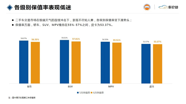 從市場環境來看,新車市場的強勢競爭成為影響二手車市場狀況的重要因素。疊加部分地區暴雨極端天氣的影響,二手車市場表現低迷。本月各級別保值率仍無“抬頭”跡象,轎車保值率為56.35%,SUV有2%的跌幅,MPV維持在55.51%,皮卡與上月基本持平,達53.37%。從整體數據看,各級別保值率相差不大。