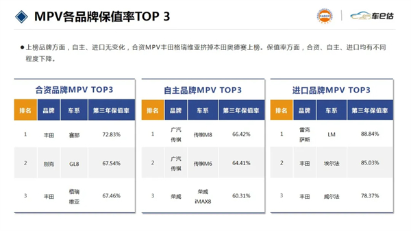 本月合資MPV出現新“面孔”,豐田格瑞維亞實力擠掉奧德賽上榜,排名第三,保值率為67.46%。今年4月上市的格瑞維亞,在空間舒適性、燃油經濟性、安全性能上表現搶眼,外觀顏值也立足于年輕用戶的審美,贏得了市場的認可。榜單第一、第二仍由豐田賽那、別克GL8奪得,兩者保值率依次為72.83%、67.54%,環比上月,有小幅下滑。