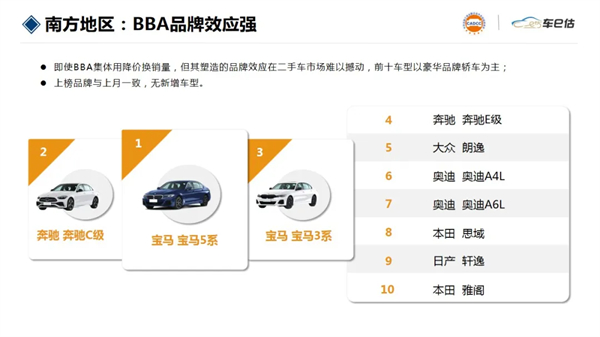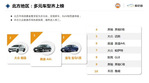 北方地區熱銷榜單前五排名變化較大,奧迪A6L延續上月的優勢穩坐第一,寶馬5系排名第三,相較上月下滑一個名次。而上月排名第五的大眾朗逸本月躥升至第二。奔馳E級與上月一樣,保有榜單第四的位置,上月熱銷季軍大眾邁騰則排名第五。榜單下游的情況變化不大,奧迪A4L與大眾帕薩特位置互換,別克GL8、奔馳C級、本田雅閣排名與上月一致,分列榜單第八至第十。從地域特點看,北方市場對車型的需求較南方地區多元,上榜車型既有轎車,也有SUV。