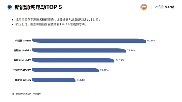 純電動車市場,保時捷Taycan蟬聯第一,但多家保時捷門店開啟7折甩賣,其保值率受到影響,較之上月有3.25%下降,達80.18%。此外,由于新車價格戰“常態化”帶來的市場連鎖反應仍在,其余上榜車型保值率均有不同程度的下降,排名第二、第三的特斯拉Model 3和Model Y,本月兩者保值率分別降至76.60%、74.55%。廣汽埃安AION Y下降至71.80%,比亞迪秦PLUS為67.64%。