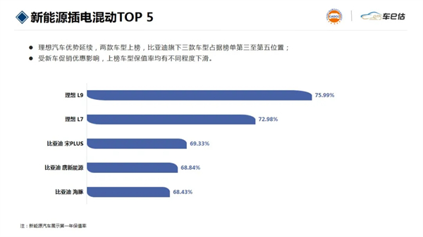 近幾年,插電混動市場的車型明顯增多。從消費端看,混動車型的市場接受程度也與日俱增,例如比亞迪、理想等品牌的插電混動車型銷量上升勢頭突出。具體來看,理想汽車本月有兩款車型進入前五榜單,理想L9、L7分列第一、第二,兩者保值率均超過70%。比亞迪宋PLUS、唐新能源、海豚位列榜單第三至第五,這三款車型的保值率非常接近,分別為69.33%、68.84%、68.43%。