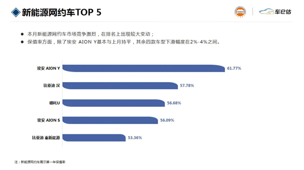 網約車市場越發飽和,加劇車企之間的競爭,尤其是依靠網約車打開市場的車企。從具體車型來看,廣汽埃安AION Y保有第一名的優勢,但AION S下滑至第四,兩者保值率分別為61.77%、56.09%。比亞迪漢從上月的第四躍升至本月第二,保值率為57.78%。哪吒U也有兩個名次的上升,位列第三,保值率為56.68%。比亞迪秦新能源排名第五,保值率較之上月有小幅下滑。