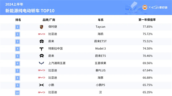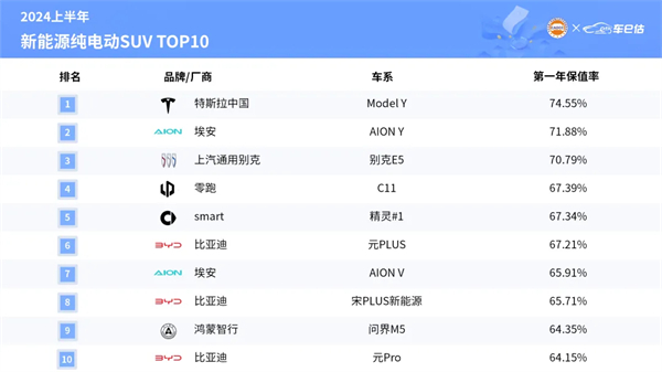 純電動SUV領域,特斯拉Model Y以一年74.55%保值率位居榜首。埃安AION Y排名第二,別克E5第三。零跑C11、smart 精靈# 1分列第四、第五。榜單下游第六至第十席位,由比亞迪、埃安、鴻蒙智行旗下車型瓜分。