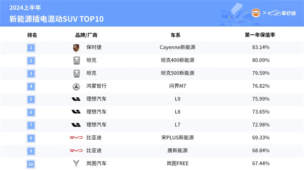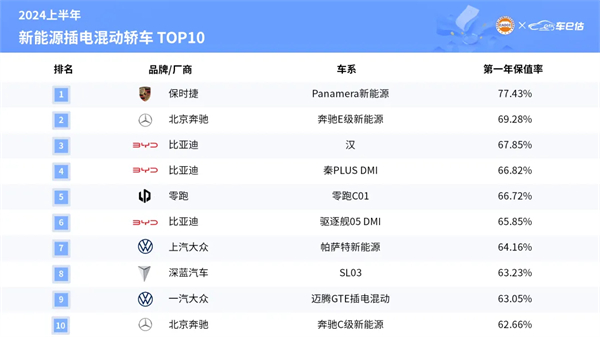 插電混動轎車前十排名,上榜品牌較多元化。既有豪華品牌保時捷、奔馳,也有價格較親民的零跑。有傳統車企大眾、比亞迪,也有新能源汽車圈的“后來者”深藍汽車。保值率方面,前五車型在66%以上。榜單第六至第十車型保值率維持在62%-65%之間。