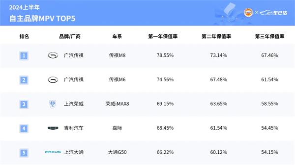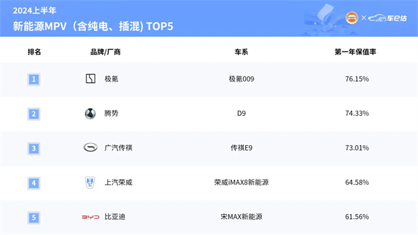 新能源MPV這一品類的較量,極氪009拔得頭籌,保值率為76.15%。排在第二位的是騰勢D9,保值率達74.33%。廣汽傳祺E9位列第三,保值率為73.01%。上汽榮威i MAX8新能源、比亞迪宋MAX新能源分列第四、第五。