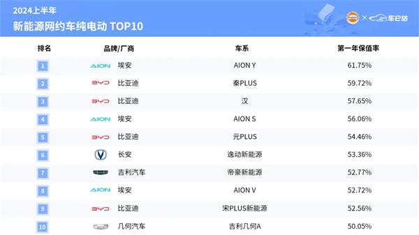 在網約車市場占據顯著份額的廣汽埃安與比亞迪,兩者共有七款車型上榜新能源網約車純電動前十榜單。其中,AION Y、AION S、AION V分列第一、第四、第八。比亞迪秦PLUS、漢、元PLUS、宋PLUS新能源排名第二、第三、第五、第九。此外,長安逸動新能源、帝豪新能源、吉利幾何A進入前十。